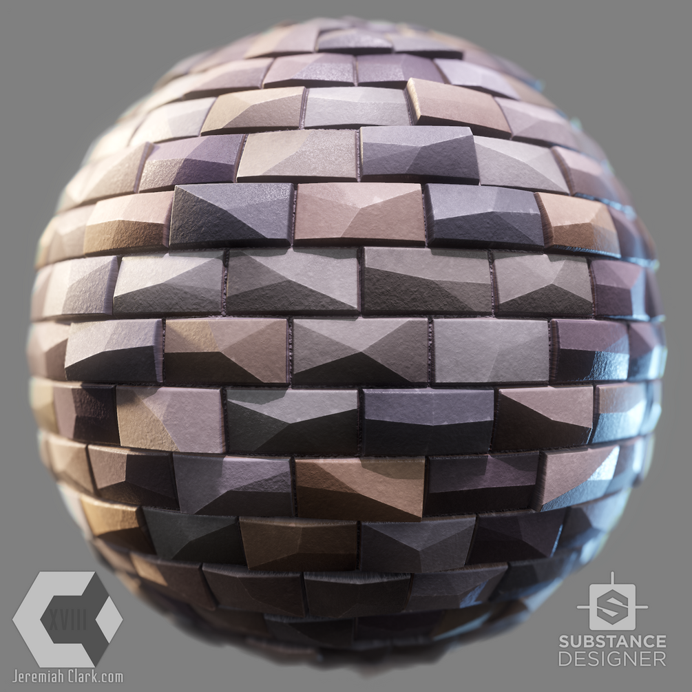 100% procedural stylized stone wall substance. There are a good number of exposed options (see screenshot), and optional inputs for a custom stone pattern, base color, and gradient color input.